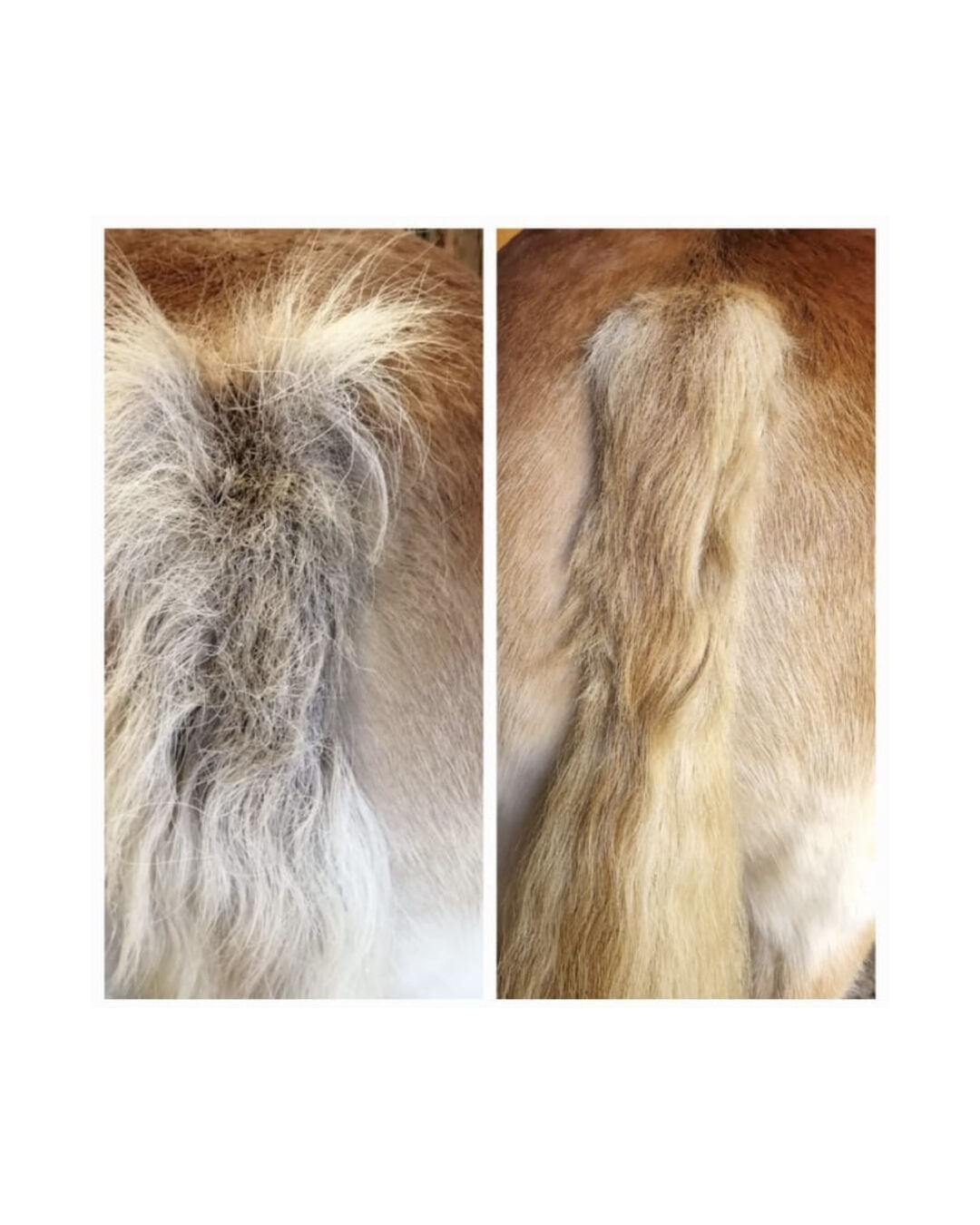 Erklärung zum Vorher-Nachher-Bild 3: Behandlungsdauer bei Schweifscheuern: 10 Wochen. 1x pro Woche mit der Deep Cleaning Mask und tägliche Anwendung des Hair Activators erzielten das Ergebnis.