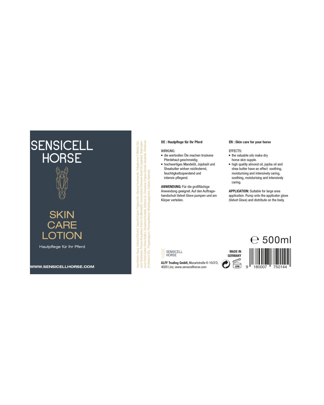 Die Skin Care Lotion von SENSICELL HORSE macht die Haut deines Pferdes geschmeidig, lindert Reizungen und stärkt die Hautbarriere, sodass sich die Haut weich und prall anfühlt.