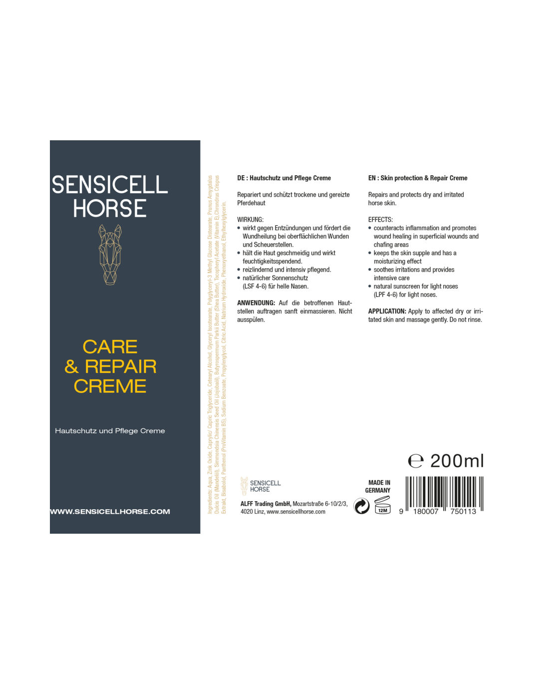Die Care & Repair Cream von SENSICELL HORSE bietet deinem Pferd eine intensive Hautpflege und Schutz, besonders bei trockener und gereizter Haut.