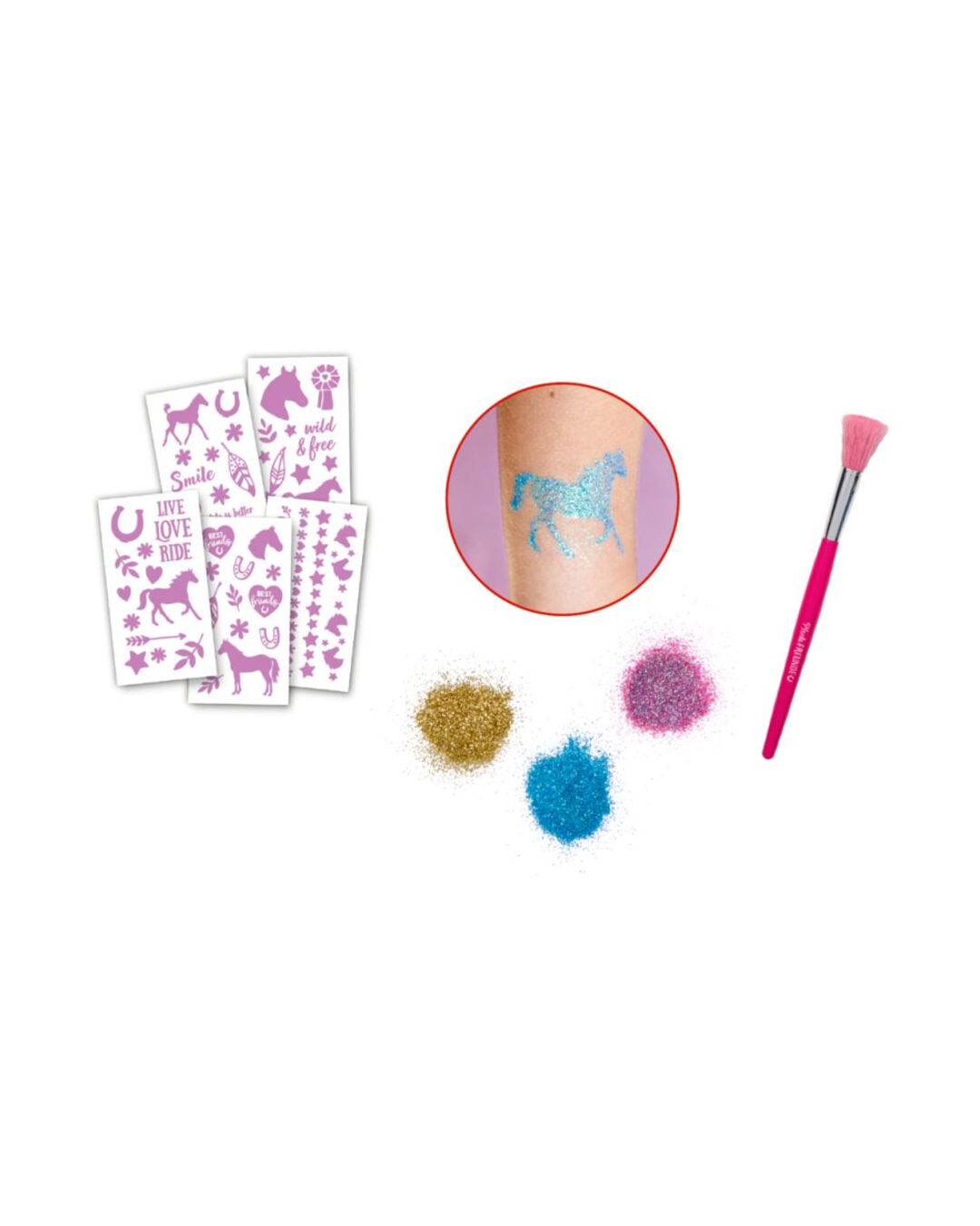 Das Set enthält 54 süße Klebemotive rund ums Thema Pferd sowie drei Glitzerpuder in Gold, Pink und Türkis. Mit dem weichen Pinsel kannst du die Motive ganz einfach und präzise auftragen – so entstehen im Handumdrehen funkelnde Tattoos. Die Anwendung ist kinderleicht, und wenn du genug geglitzert hast, lassen sich die Tattoos hautfreundlich mit etwas Seife wieder entfernen. Damit eignet sich das Set nicht nur für kleine Pferdefreunde, sondern auch super als Geschenkidee für Kindergeburtstage oder den nächsten Spielenachmittag.