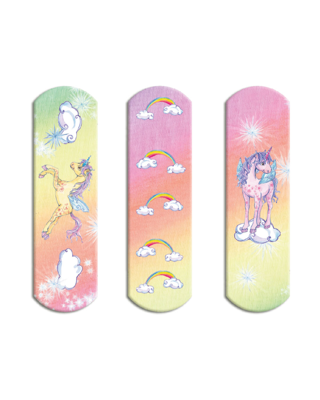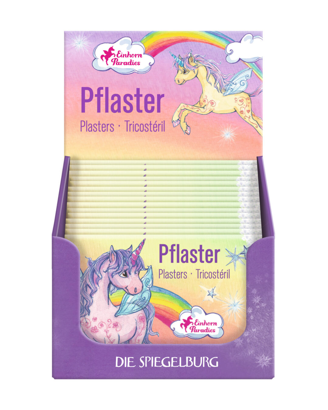 Mit diesen niedlichen Pflasterstrips Einhorn-Paradies von Spiegelburg mit Motiven aus dem Einhorn-Paradies ist bald alles wieder gut! Das Set besteht aus 10 medizinischen Pflasterstrips mit farbigem Druck: hypoallergen, atmungsaktiv und wasserfest, in bunt bedrucktem Briefchen.