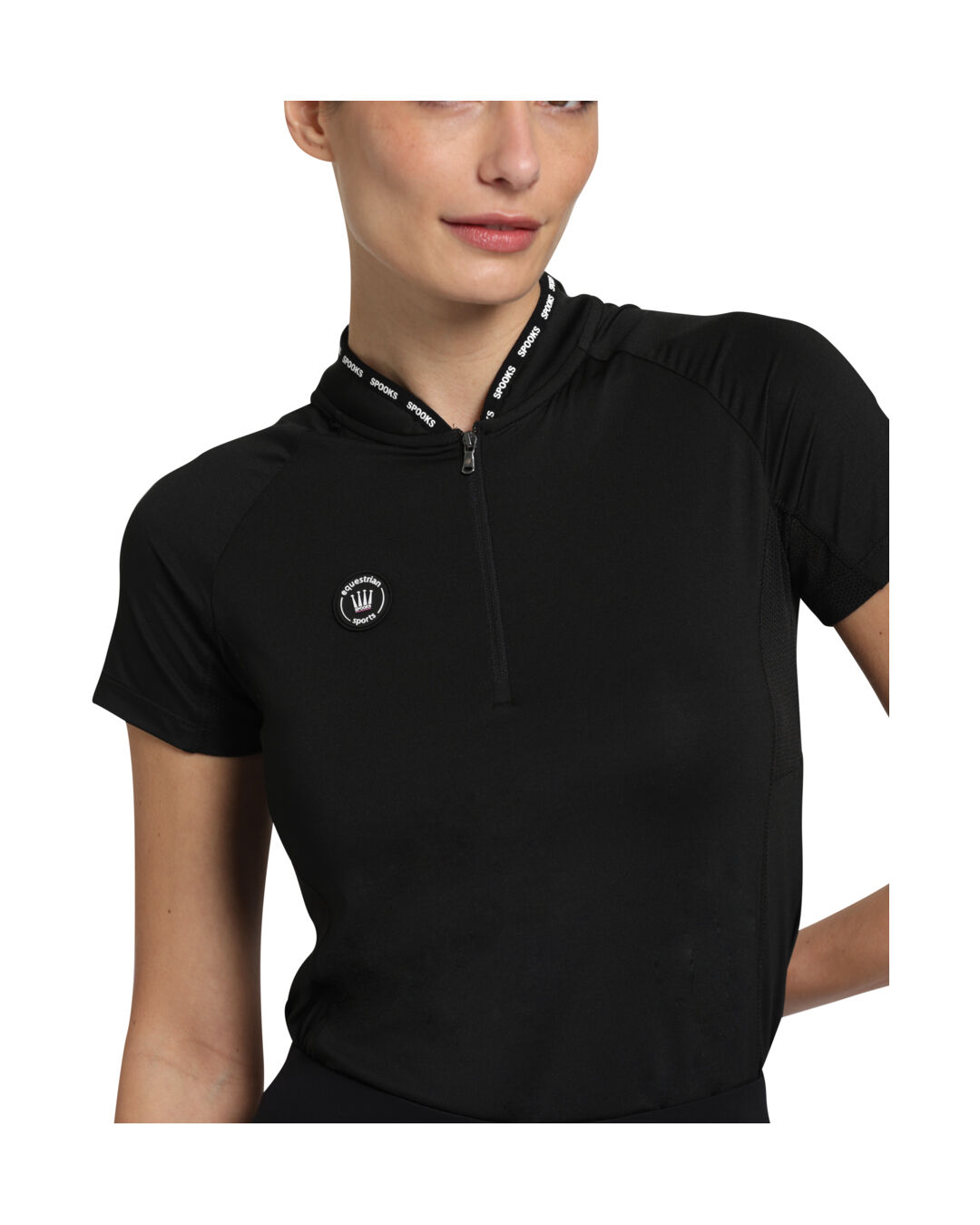 Hergestellt aus einem leichten Funktionsstoff, bietet das Sport Shirt Sinah optimalen Komfort und ist perfekt für heiße Tage. Die luftdurchlässigen Netzeinsätze unter den Armen und am Rücken sorgen für eine ausgezeichnete Atmungsaktivität und Belüftung während des Reitens. Der Reißverschluss am Kragen ermöglicht ein leichtes Überziehen und verleiht dem Shirt einen sportlichen Look.