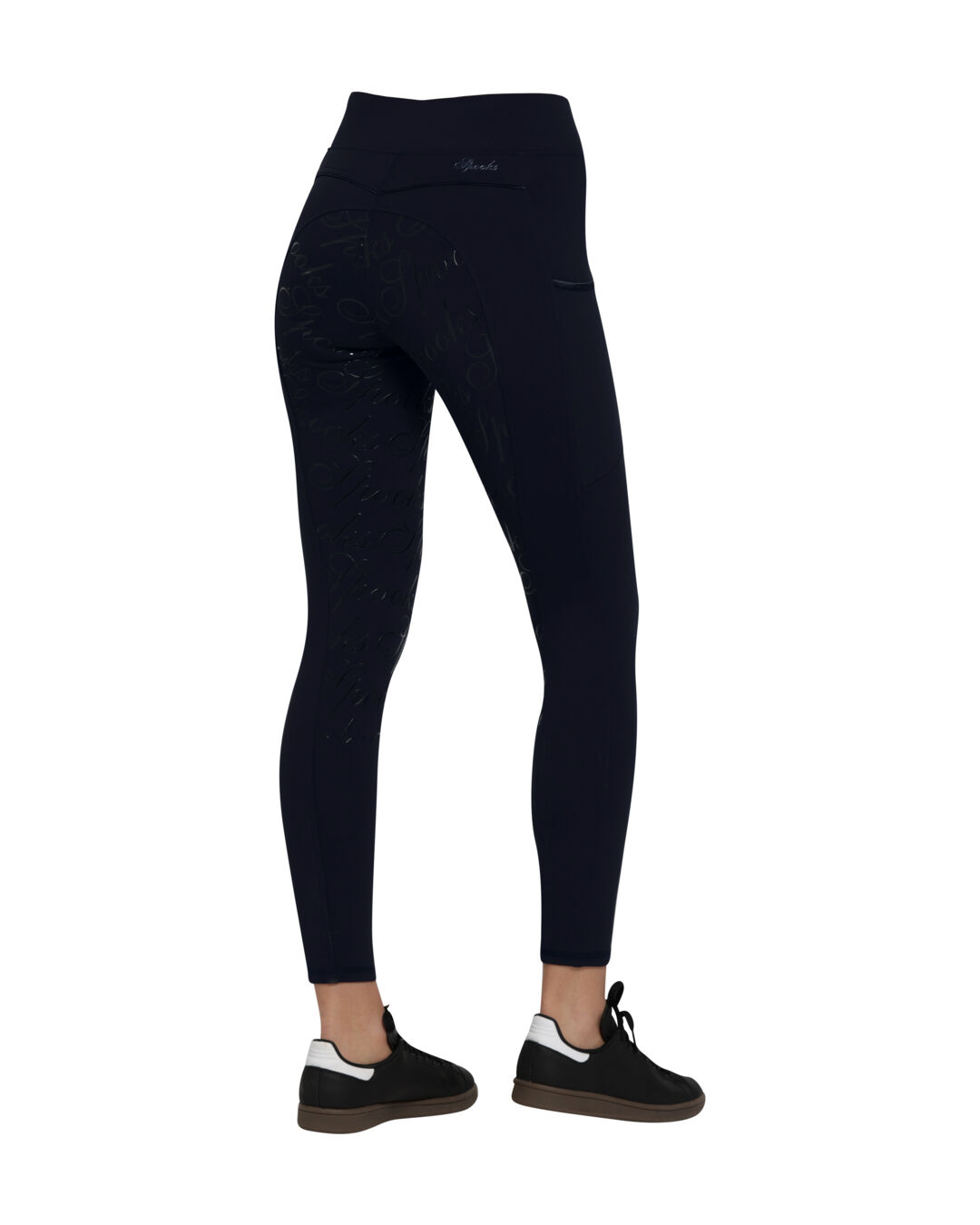 Hergestellt aus robustem Stretchmaterial, passt sich die Reitleggings perfekt an deinen Körper an und bietet dir maximale Bewegungsfreiheit. Der breite Bund sorgt für einen angenehmen Sitz über der Hüfte, während die V-förmigen Nähte im Rückenbereich eine schmeichelhafte Passform bieten.