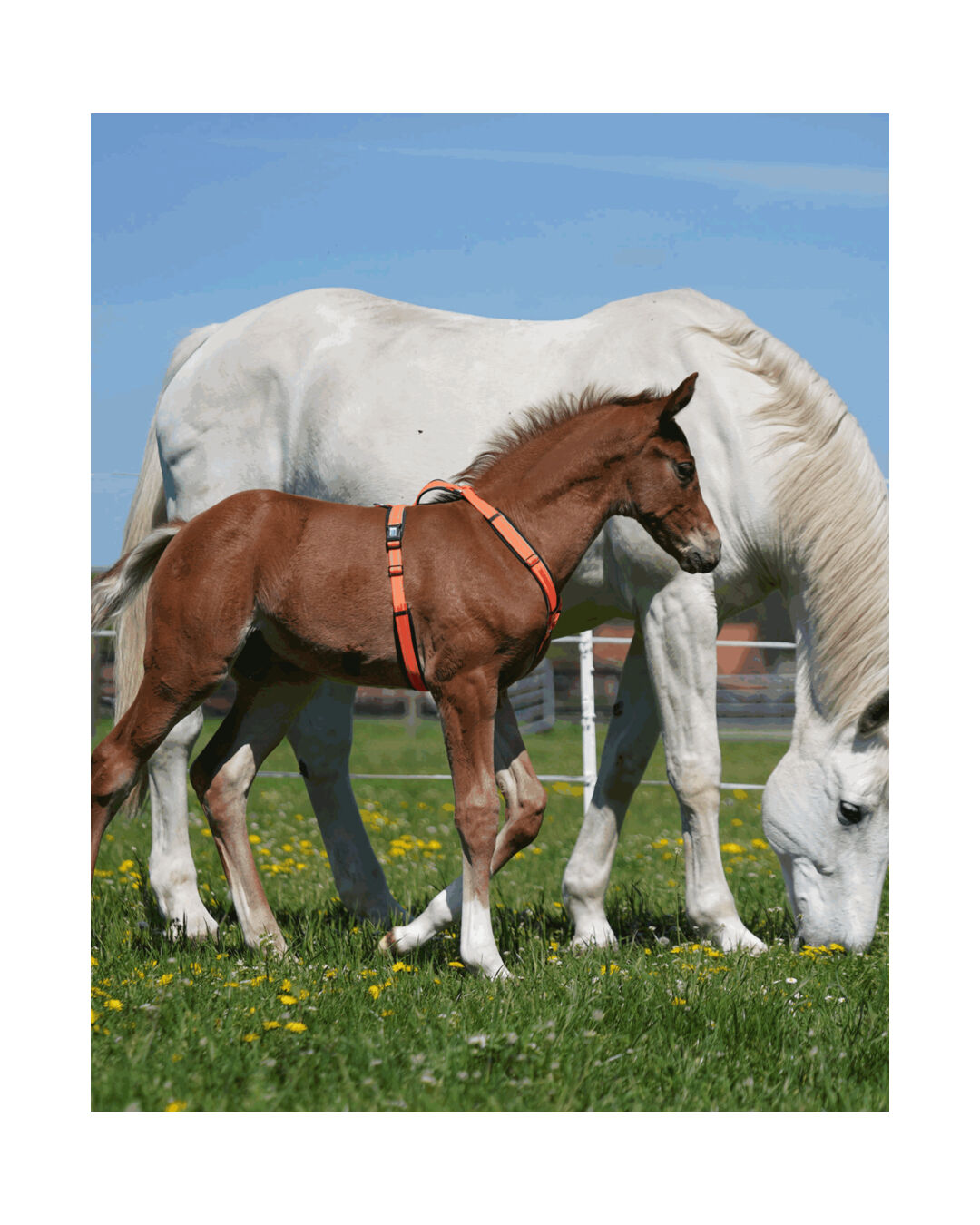 Diese Kombination ermöglicht es, den kleinen Neuankömmling sicher zu führen – sei es auf dem Weg zur Weide, über eine Straße, oder nach einer Verletzung, wenn das Fohlen kontrolliert bewegt werden muss.