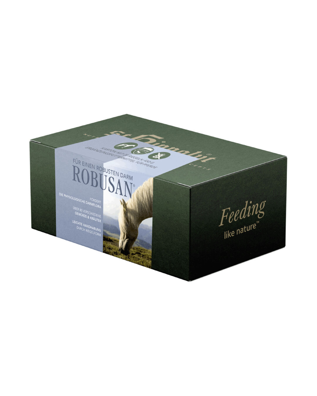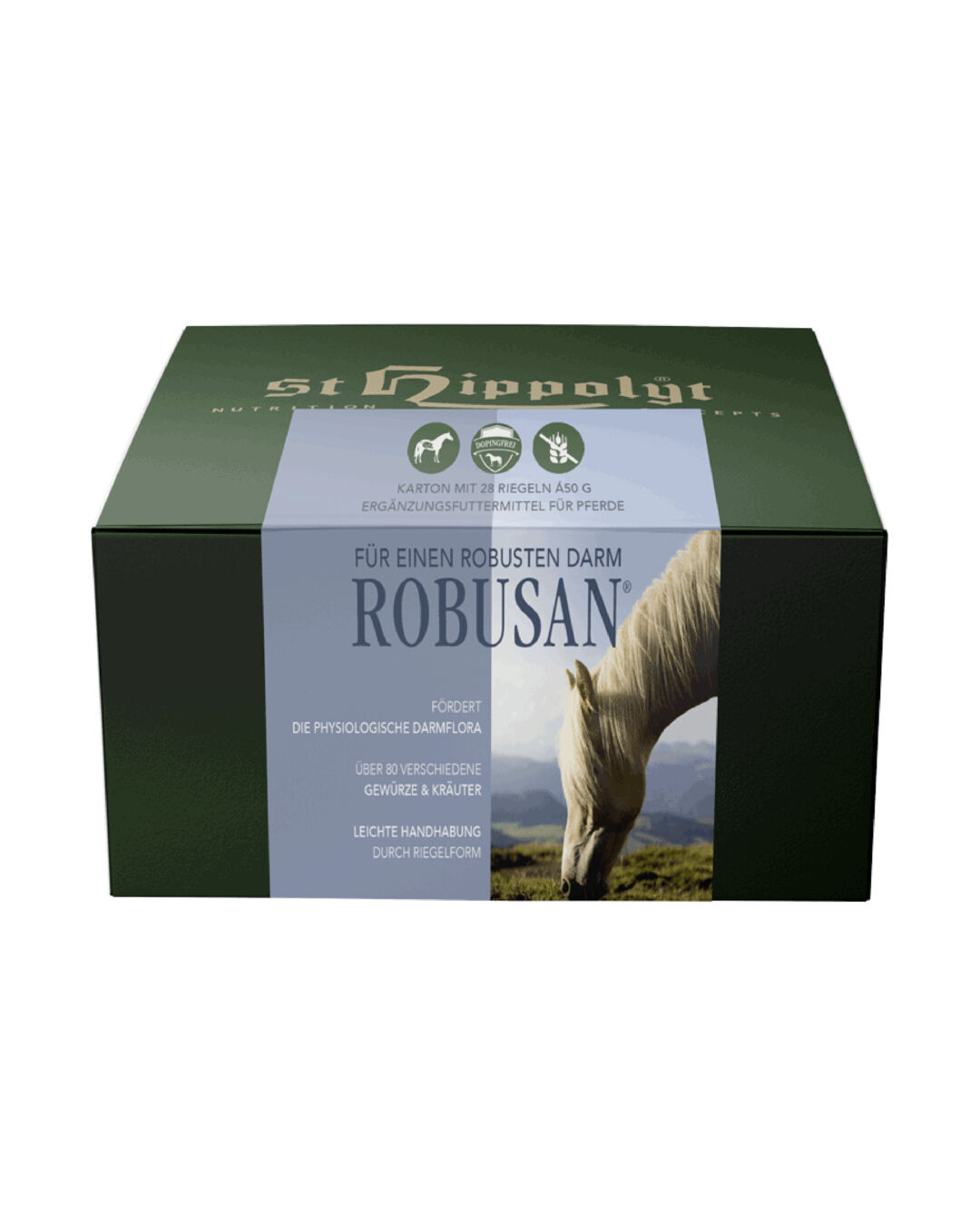 Wenn dein Pferd an hartnäckigem Kotwasser leidet oder immer wieder Verdauungsbeschwerden hat, kann der Darmriegel Robusan von St. Hippolyt genau die Unterstützung bieten, die es braucht – eine Packung enthält 28 Darmriegel.