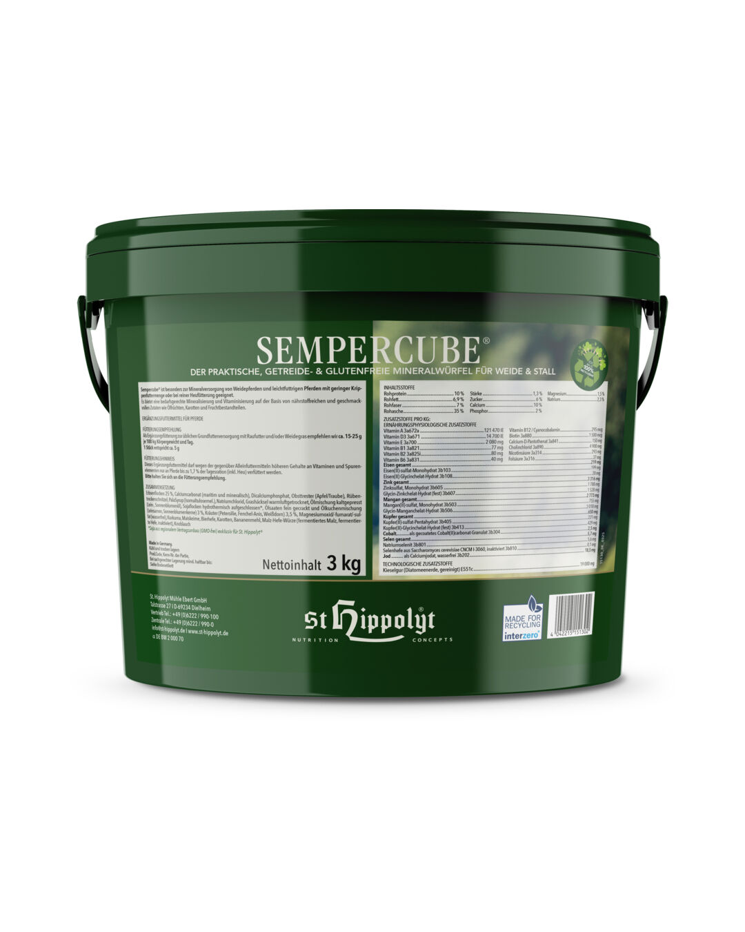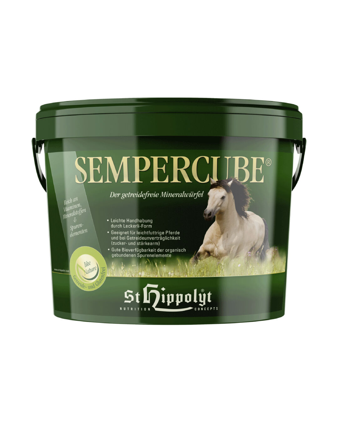 St. Hippolyt Sempercube ist der handliche, getreide- und glutenfreie Mineralwürfel, der speziell für leichtfuttrige Pferde, Weidehaltung oder reine Heufütterung entwickelt wurde. Die kompakte Leckerli-Form macht die Gabe besonders unkompliziert – ideal, wenn du dein Pferd gezielt und zuverlässig mit allen wichtigen Mineralstoffen und Vitaminen versorgen möchtest.