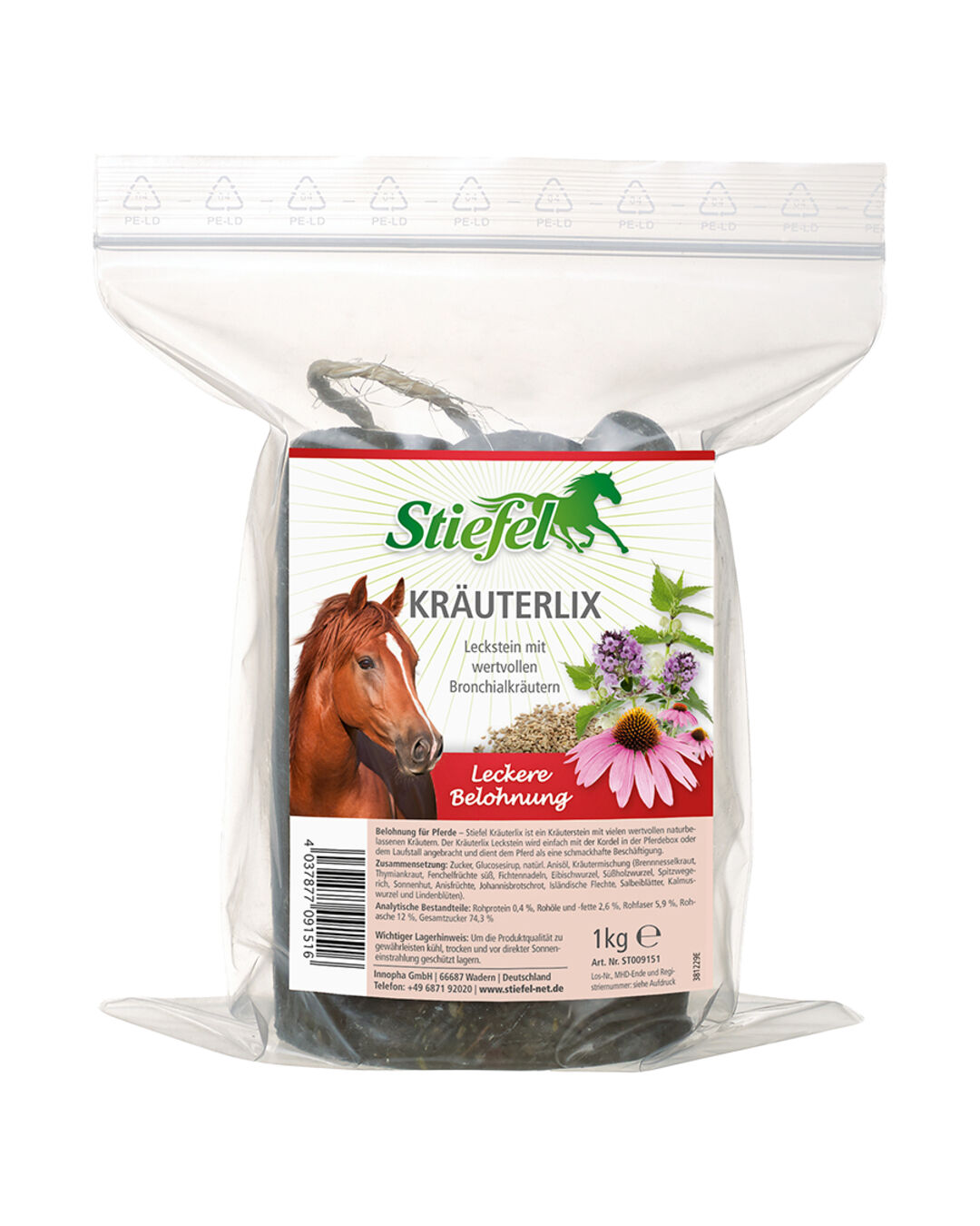Natürliche Beschäftigung mit wertvollen Kräutern – der Stiefel Kräuterlix Leckstein ist die perfekte Ergänzung für die Pferdebox oder den Laufstall. Der schmackhafte Kräuterstein enthält viele naturbelassene Kräuter und bietet deinem Pferd eine sinnvolle und wohltuende Beschäftigung.