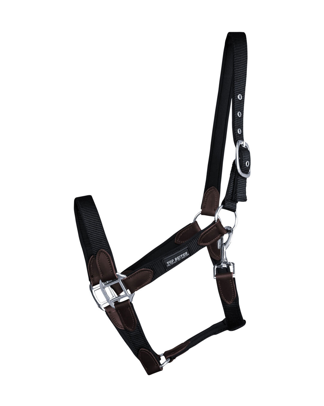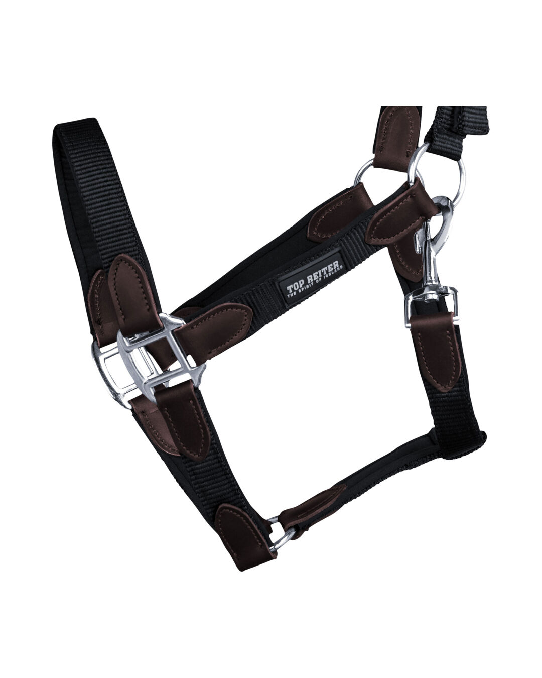 Das Genick des Halfters ist extra gepolstert und das sehr weiche und flexible Nylon liegt bequem an, sodass es weder scheuert noch drückt. Besonders schön wirken die abgesetzten Elemente aus braunem Leder, die den klassischen, hochwertigen Look unterstützen. Das Topreiter Logo ist dezent am Genickstück platziert.
