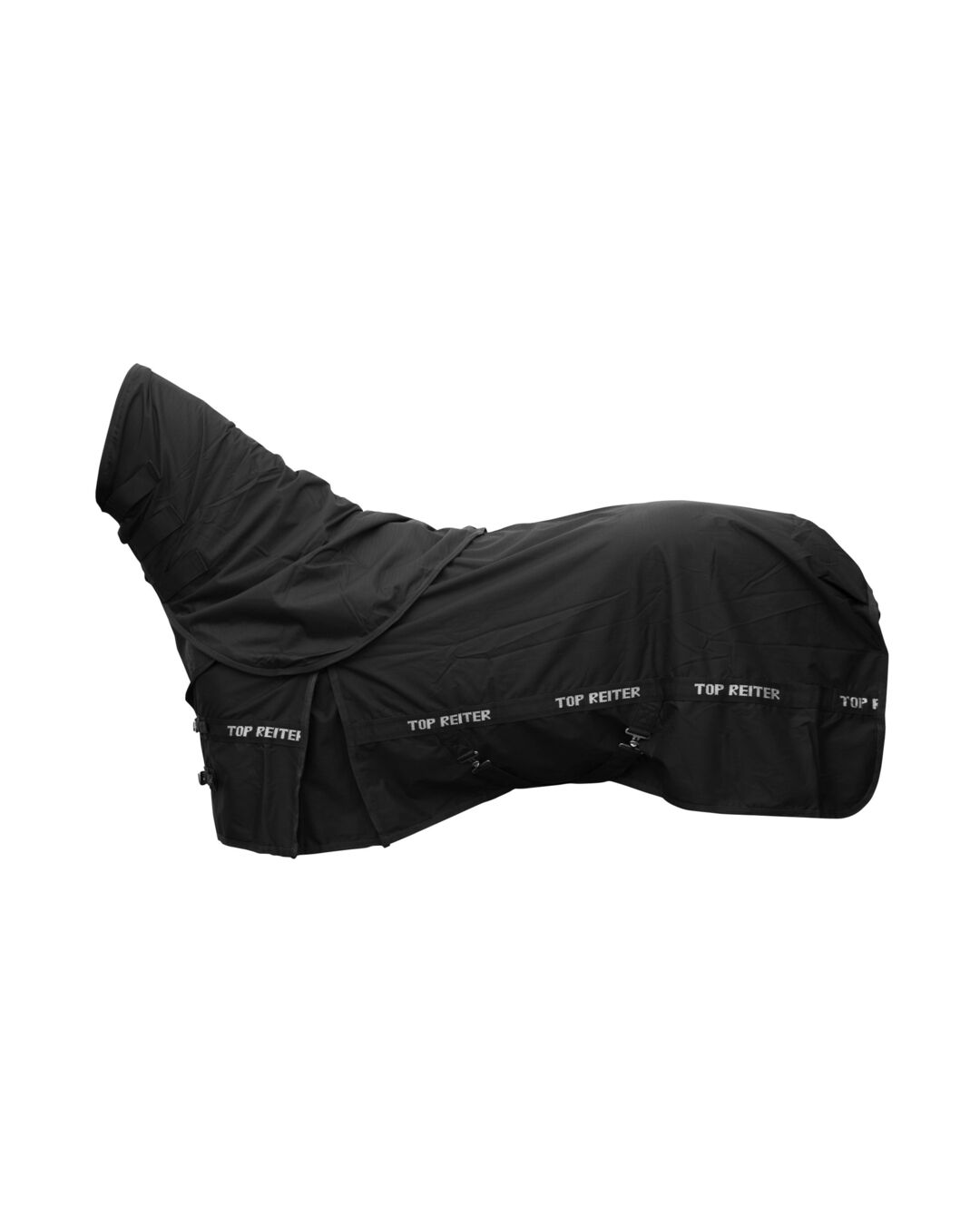 Es wird mit elastischen Klettverschlüssen geschlossen und engt dein Pferd nicht ein. Zusätzlich kannst du das Halsteil mit drei Karabinern an der Decke befestigt werden, ohne die Bewegungsfreiheit einzuschränken. Die Decke verfügt auch über einen Schweiflatz für zusätzlichen Schutz und wird in einem praktischen Aufbewahrungsbeutel geliefert.