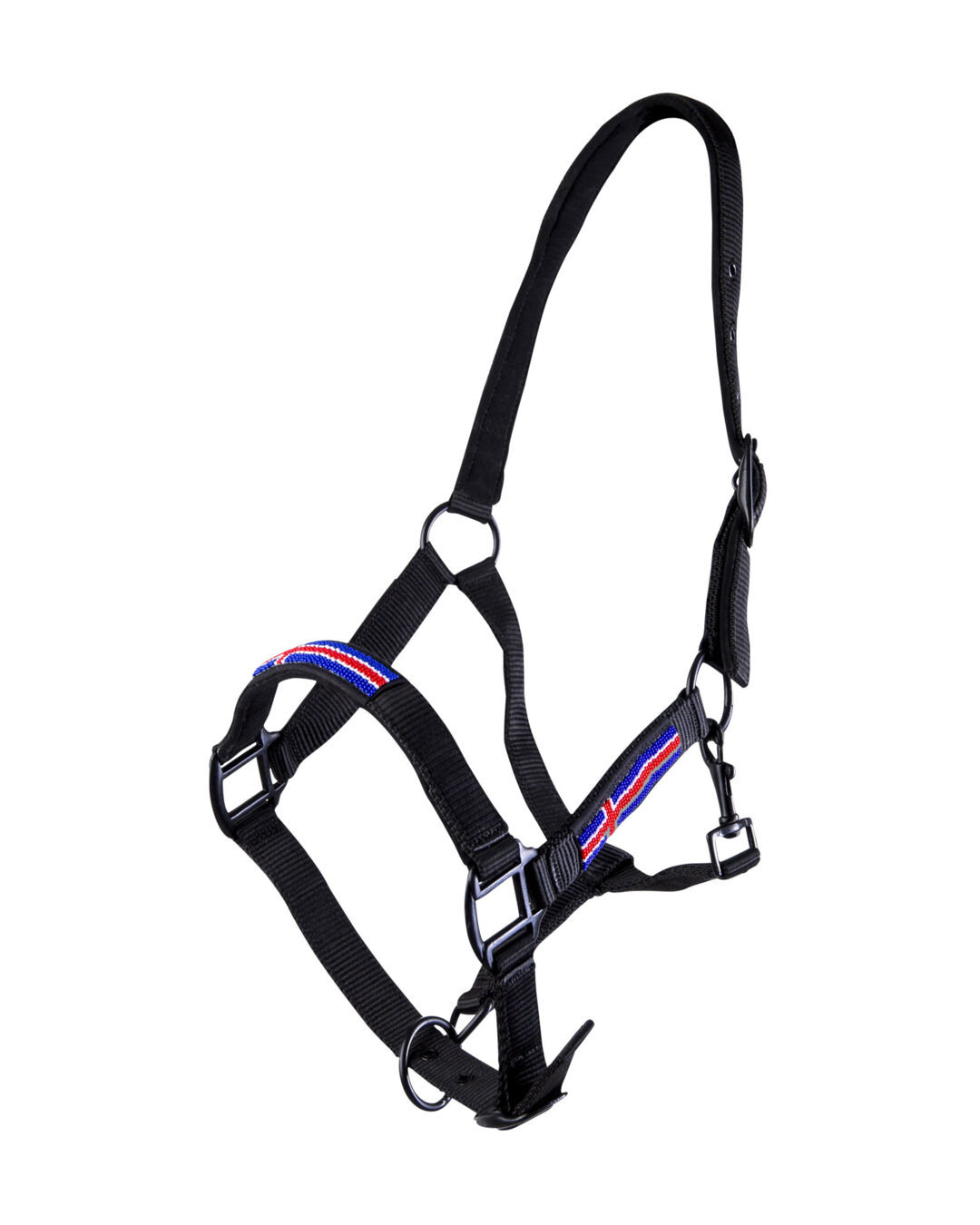 Das Halfter kann am Genick- und am Nasenriemen stufenweise verstellt werden, sodass es wunderbar an jeden Isländer angepasst werden kann. Selbstverständlich ist es am Nasenriemen und im Genick zudem extra weich gepolstert. Die Besonderheit dieses Halfters liegt in den aus Perlen gestickten Islandflaggen auf dem Nasenriemen und an den Seiten.
