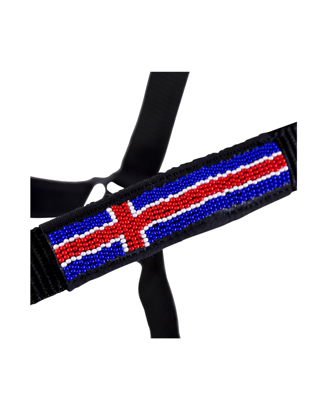- Aus Perlen gestickte Islandflaggen auf dem Nasenriemen und an den Seiten