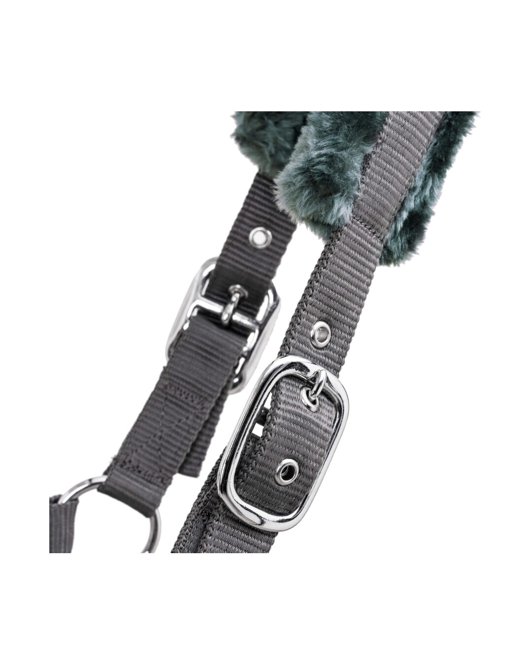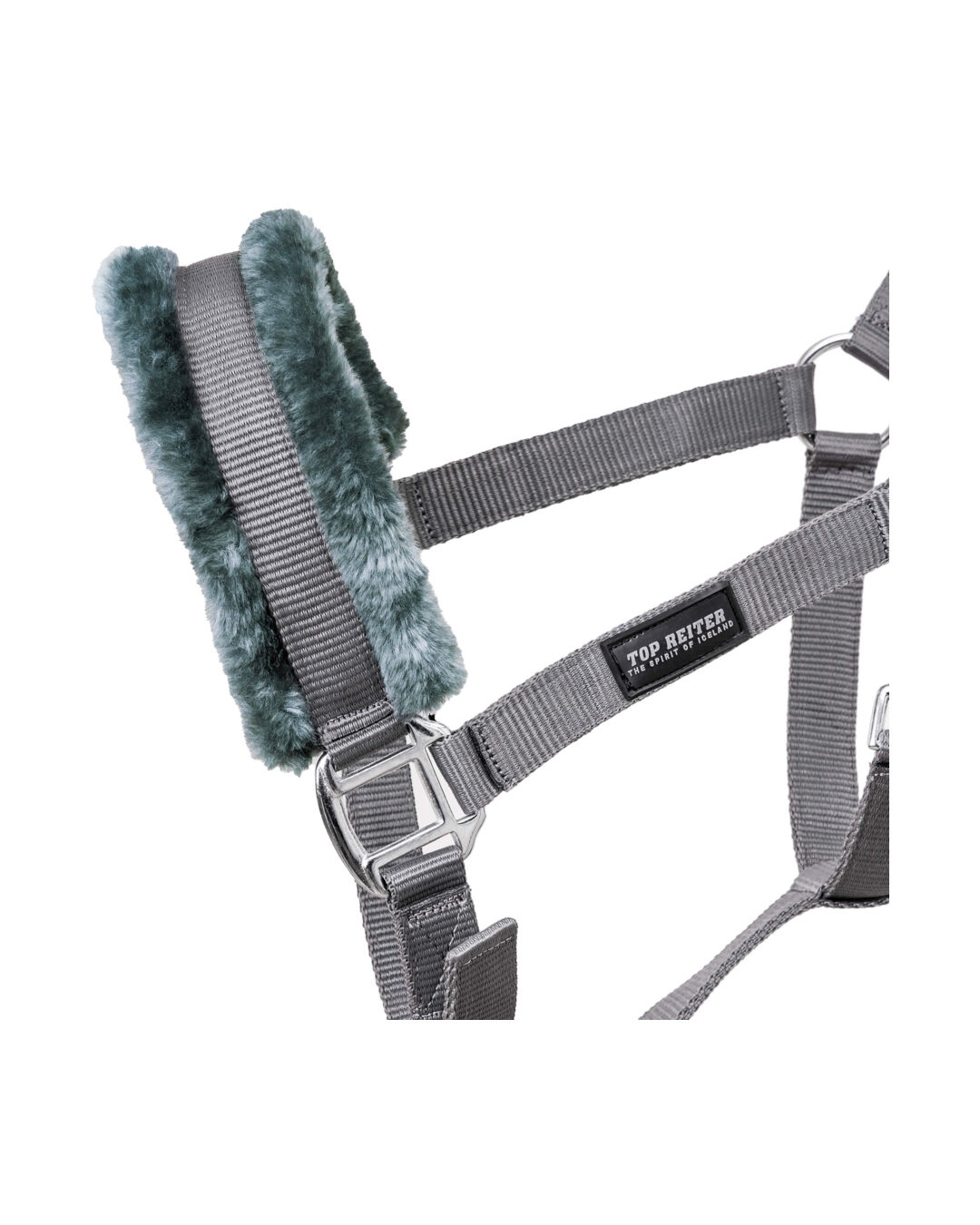 Das unterlegte Nylonhalfter mit silbernen Beschlägen kann im Genick und am Nasenriemen verstellt werden, zudem ist es dort mit extrem weichem Plüsch gepolstert. Der gewebte Topreiter Schriftzug verleiht dem Halfter seinen unverkennbaren Look.