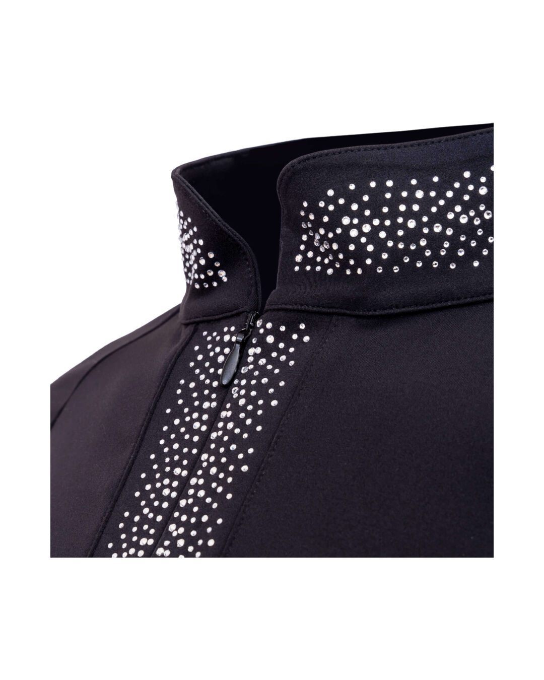 Dank der antibakteriellen Eigenschaften des Materials und der hohen Elastizität genießt du anhaltende Frische und uneingeschränkte Bewegungsfreiheit. Die kunstvolle Platzierung der Kristalle am Stehkragen und entlang des Reißverschlusses fügt deinem Look eine subtile Eleganz hinzu, die sicherstellt, dass du im Rampenlicht strahlst.