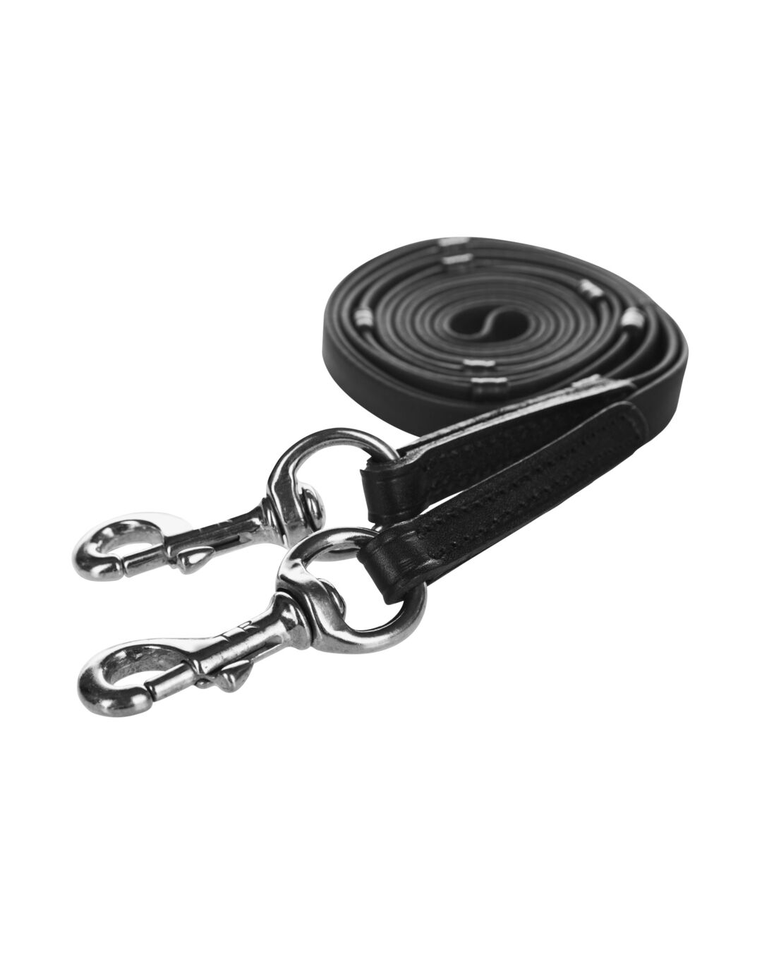 Der Zügel ist aus schwarzem Biothane® gefertigt. Er ist besonders fein und sorgt somit für eine hohe Leichtigkeit. Durch das rutschfeste Material hast du in jeder Jahres- und Wetterzeit besten Halt, was durch die Stege noch zusätzlich unterstützt wird. Ihre Länge beträgt 240 cm.