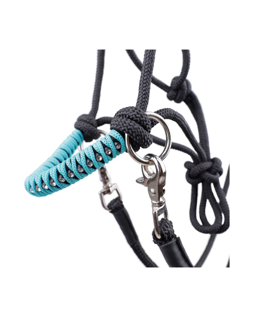 Dieses leichte Halfter bietet nicht nur Funktionalität, sondern auch ein stilvolles Design mit einem umflochtenen Nasenriemen in Kontrastfarbe, verziert mit funkelnden Glitzersteinchen, die es von herkömmlichen Halftern abheben.