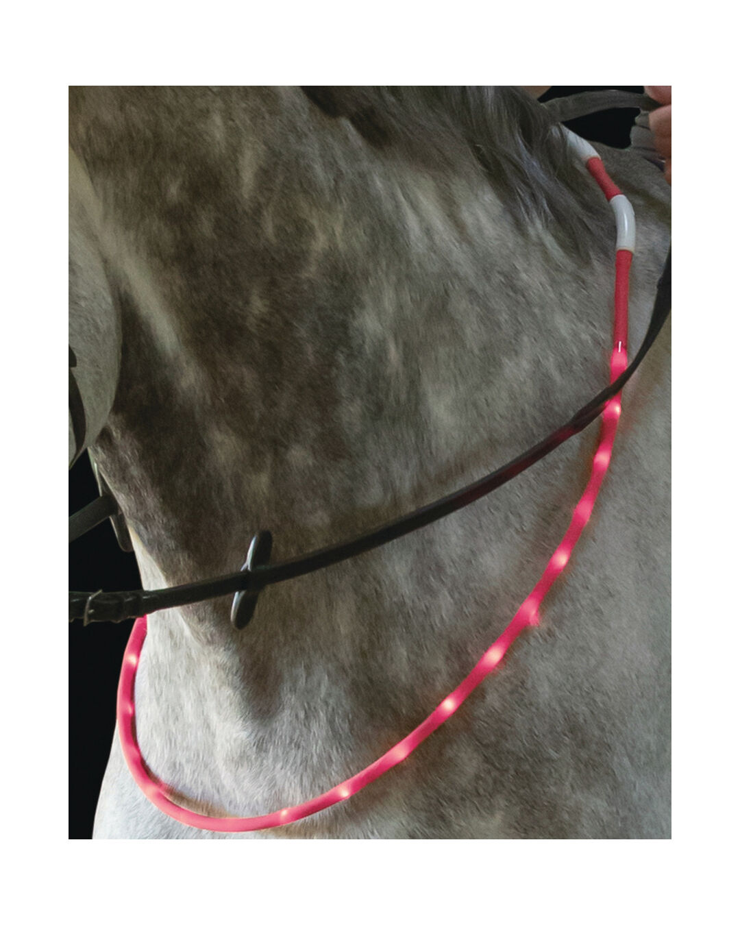 Ob bei Nebel, Regen oder in der frühen Abenddämmerung, mit dem LED-Leuchthalsring ist dein Pferd immer gut sichtbar.