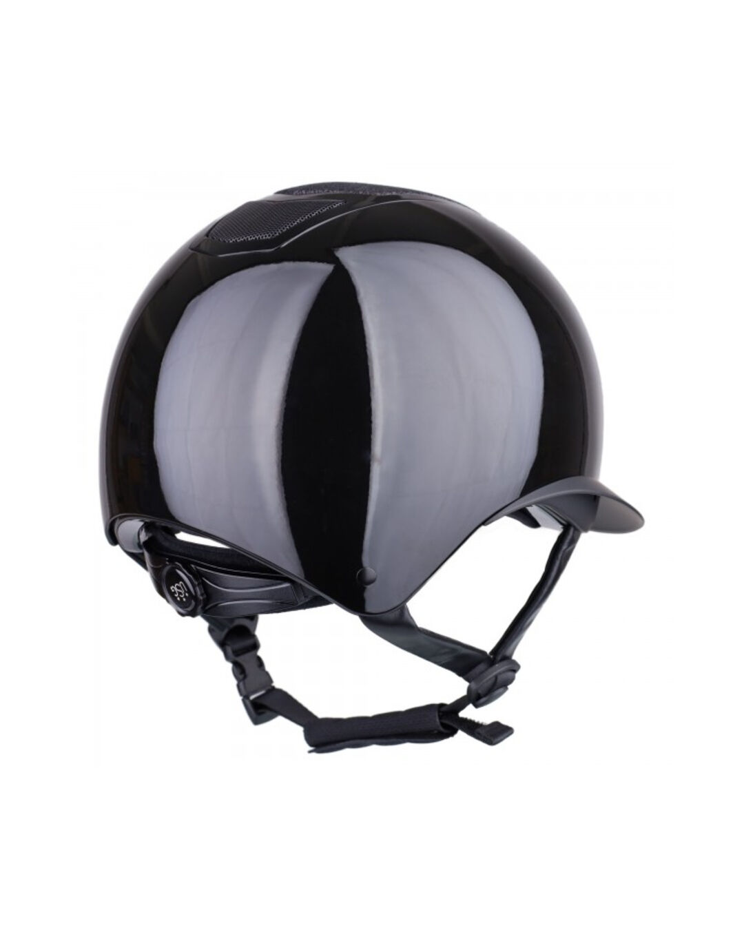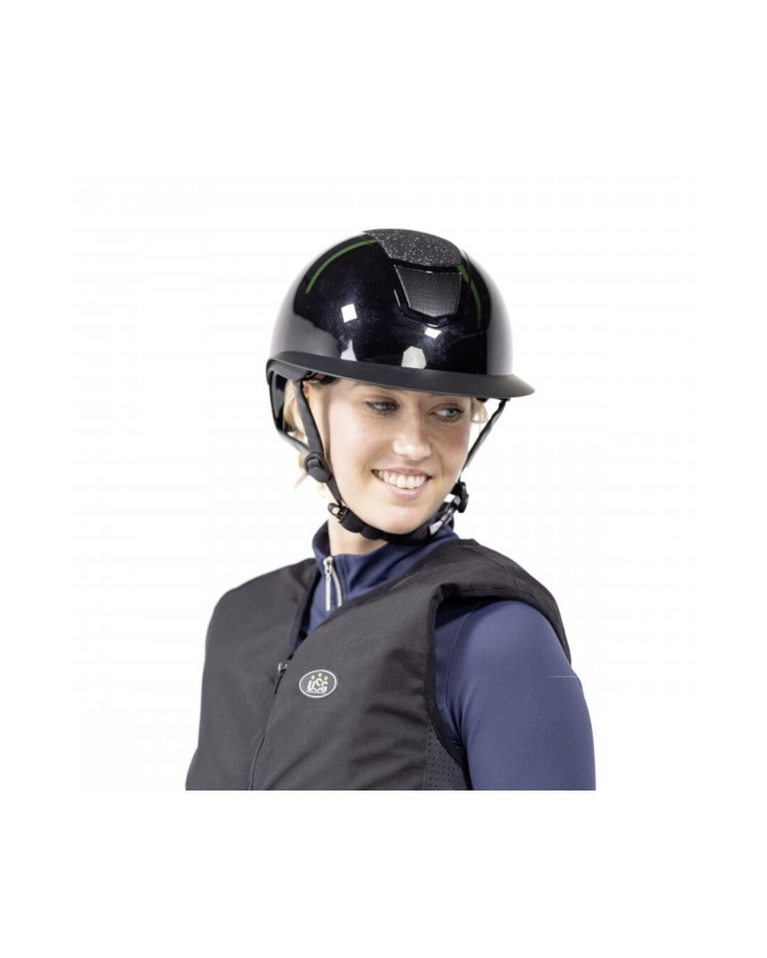 Komfort kommt ebenfalls nicht zu kurz: Das herausnehmbare, waschbare Innenfutter fühlt sich angenehm weich an, die 4-Punkt-Begurtung mit Kinnpolster liegt dank der Ummantelung aus weichem, veganem Leder sanft an. Über das Justierrad im Nacken lässt sich der Helm stufenlos anpassen – für einen sicheren Sitz, der dich beim Reiten nicht stört.