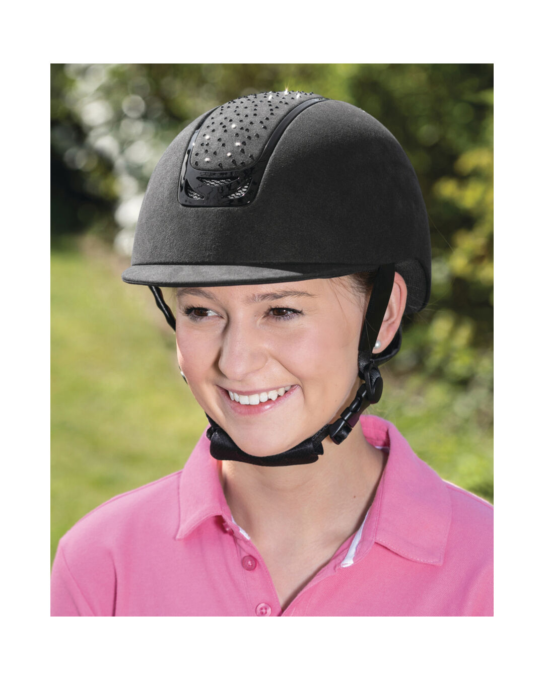 Die Außenschale ist mit weicher Mikrofaser bezogen und mit einem schmalen Schild versehen, was dem Helm eine edle Optik verleiht. Oberhalb des Schildes setzen glänzende Glitzersteine einen auffälligen, aber geschmackvollen Akzent. Innen sorgt ein angenehm weiches, herausnehmbares und waschbares Futter für ein komfortables Tragegefühl – perfekt für lange Tage im Stall oder auf dem Turnier.
