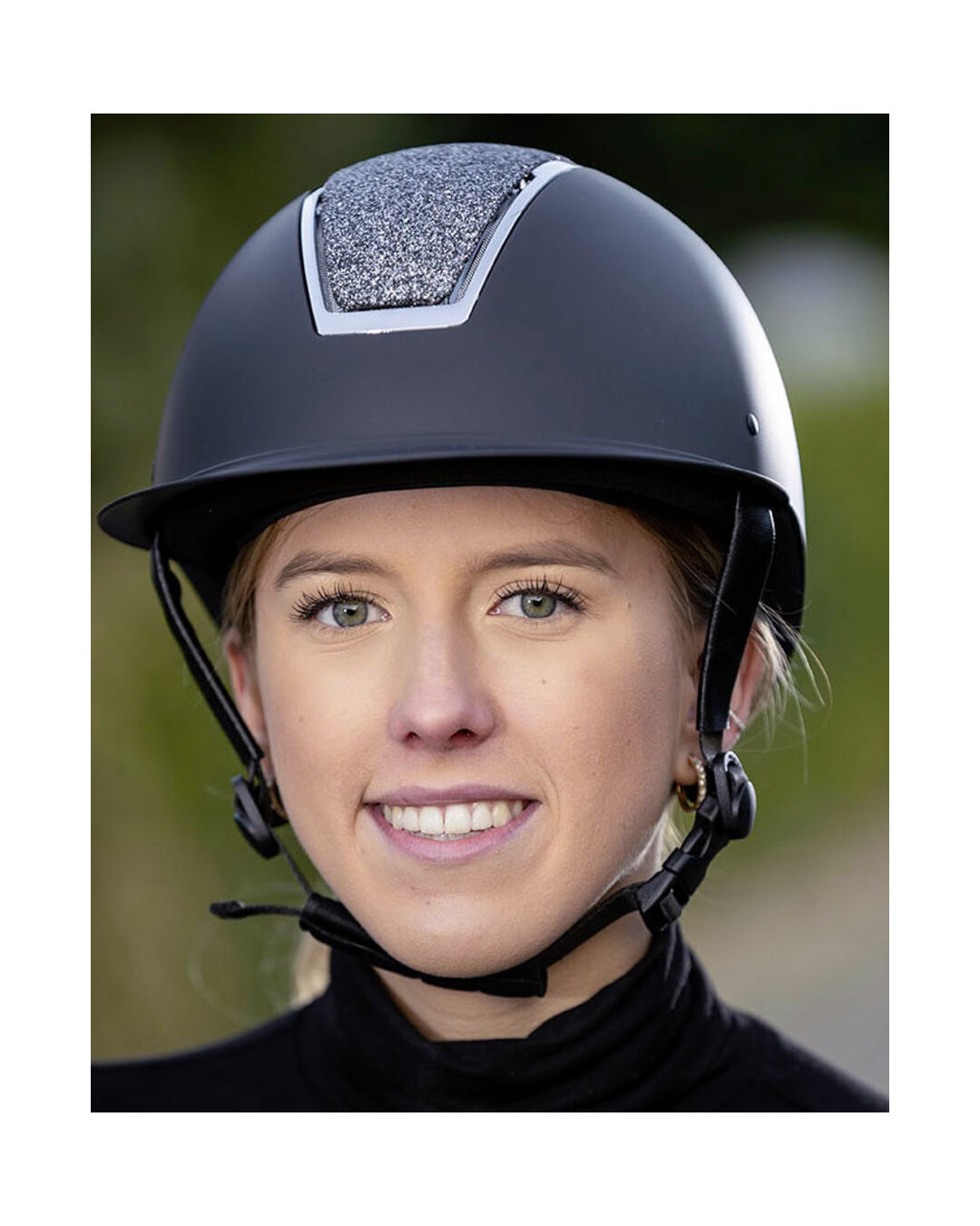Dieser Helm sticht besonders durch sein glamouröses Design hervor, das durch ein mit Glitzer besetztes Mittelstück und einen metallisch glänzenden Rahmen umgeben ist. Der Kontrast zum matten Finish des Helms sorgt für einen eindrucksvollen und wertigen Gesamtlook, der auf jedem Turnier für Aufmerksamkeit sorgt.