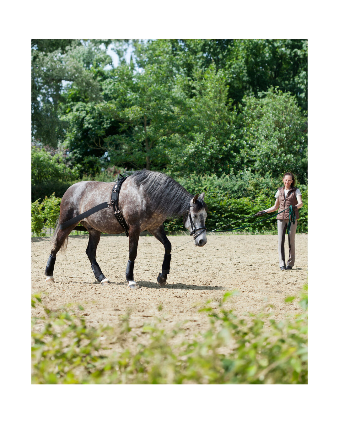 Durch die beiden praktischen Haken lässt sich das Band einfach und sicher in den Longiergurt oder Sattelgurt einhängen. Das Trainingssystem ist darauf ausgelegt, das Pferd dazu zu animieren, seine Hinterhand vermehrt einzusetzen und den Rücken aufzuwölben, was zu einer verbesserten Haltung und gesteigerten Leistungsfähigkeit führt.