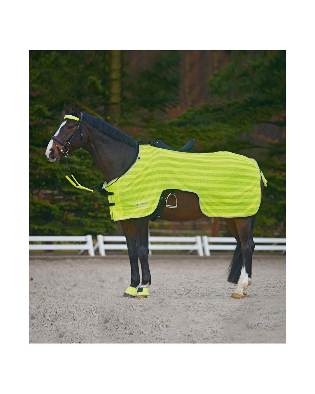 Diese leichte Ausreitdecke besteht aus stark reflektierendem Netz-Gewebe, das mit Silber-Leuchtstreifen und rundum reflektierendem Einfass ausgestattet ist. Der Sattelausschnitt und die Schweifkordel sorgen für eine gute Passform und halten die Decke auch während der Bewegung sicher am Platz.