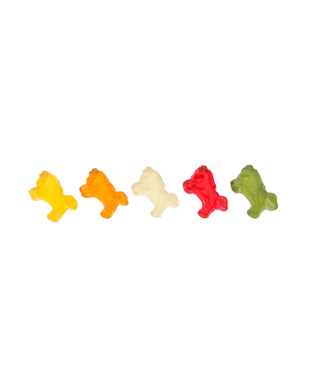 Bunte Fruchtgummis in Pferdchen-Form. Zutaten: Glukosesirup; Zucker; Gelatine; Dextrose; Fruchtsaft aus Fruchtsaftkonzentrat: Apfel, Himbeere, Erdbeere, Orange, Zitrone, Ananas; Säuerungsmittel: Citronensäure; Frucht- und Pflanzenkonzentrate: Saflor, Spirulina, Apfel, Holunderbeere, Orange, Schwarze Johannisbeere, Kiwi, Zitrone, Aronia, Mango, Traube, Passionsfrucht; Sonnenblumenöl; Aroma; Holunderbeerextrakt; Überzugsmittel: Bienenwachs weiß und gelb.