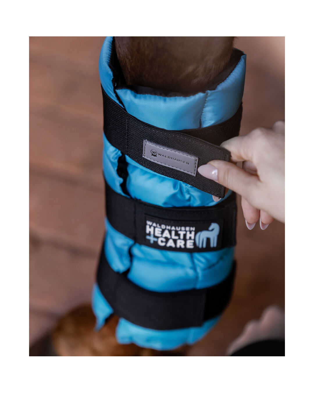 Durch ihre großzügige Größe eignet sich die Gamasche für Vorder- und Hinterbeine gleichermaßen. Die elastischen Klettverschlüsse (je nach Größe 3 oder 4 Stück) sorgen dafür, dass sie sich sicher und individuell anlegen lässt – egal ob Warmblut, Vollblut oder Pony. Praktisch: Diese Form der Kühlung spart Wasser und ersetzt den klassischen Wasserschlauch – ressourcenschonend und unkompliziert.