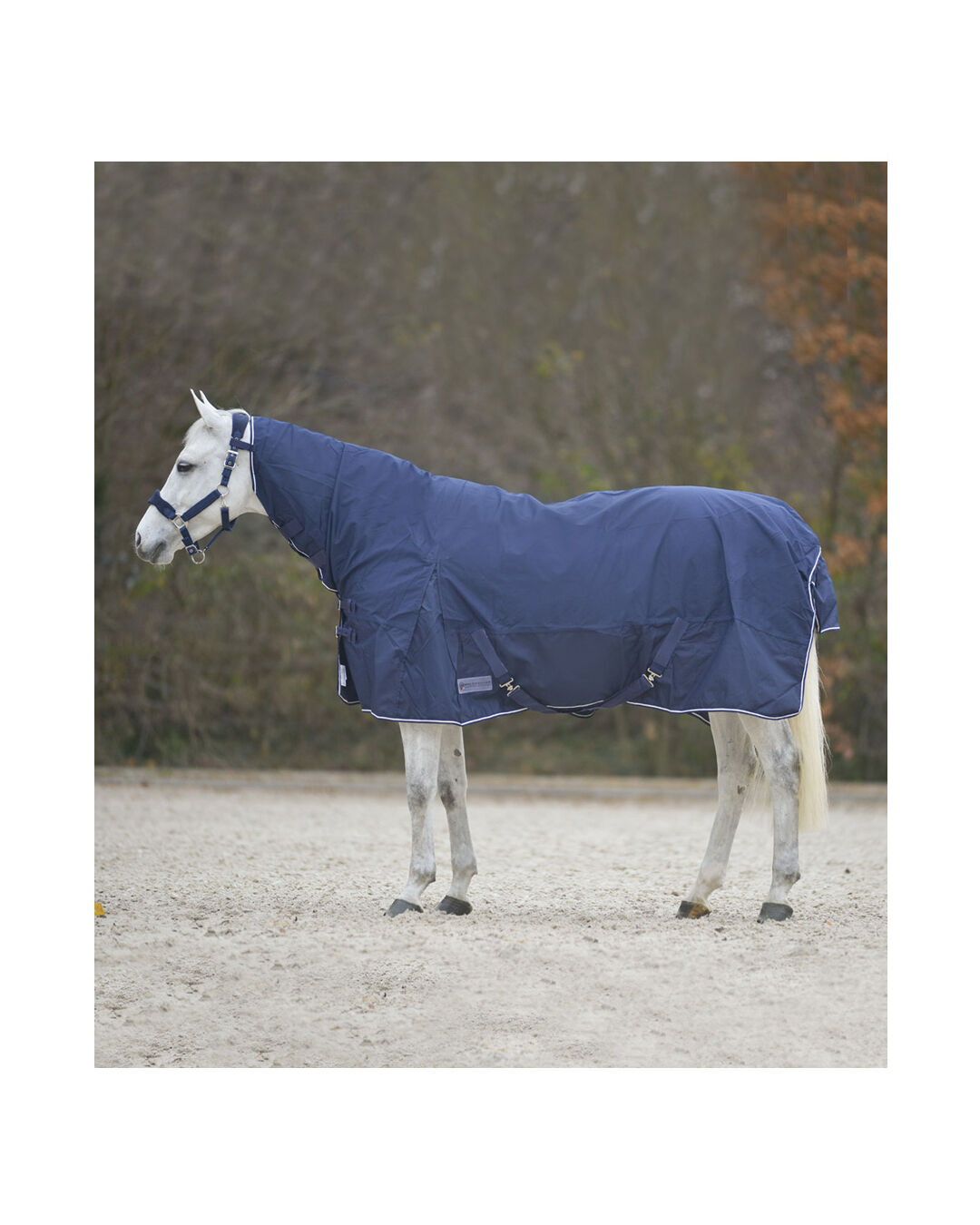 Mit ihrem strapazierfähigen 600 Denier Polyester-Obermaterial ist diese Decke wasserdicht und gleichzeitig atmungsaktiv. Das Schweiß absorbierende Innenfutter sorgt dafür, dass Feuchtigkeit schnell abtransportiert wird, wodurch dein Pferd auch bei Regen trocken und komfortabel bleibt. Die Decke ist mit einer Gehfalte ausgestattet, die für mehr Bewegungsfreiheit sorgt, sowie einem Schweiflatz und verstellbaren, abnehmbaren Beinschnüren für optimalen Halt. Kreuzgurte mit Elastikeinsatz und die doppelte, mehrfach verstellbare Frontverschnallung gewährleisten eine individuelle Anpassung. Das integrierte Halsteil wird mit zwei stufenlos verstellbaren Klettverschlüssen fixiert und bietet zusätzlichen Schutz gegen Nässe.