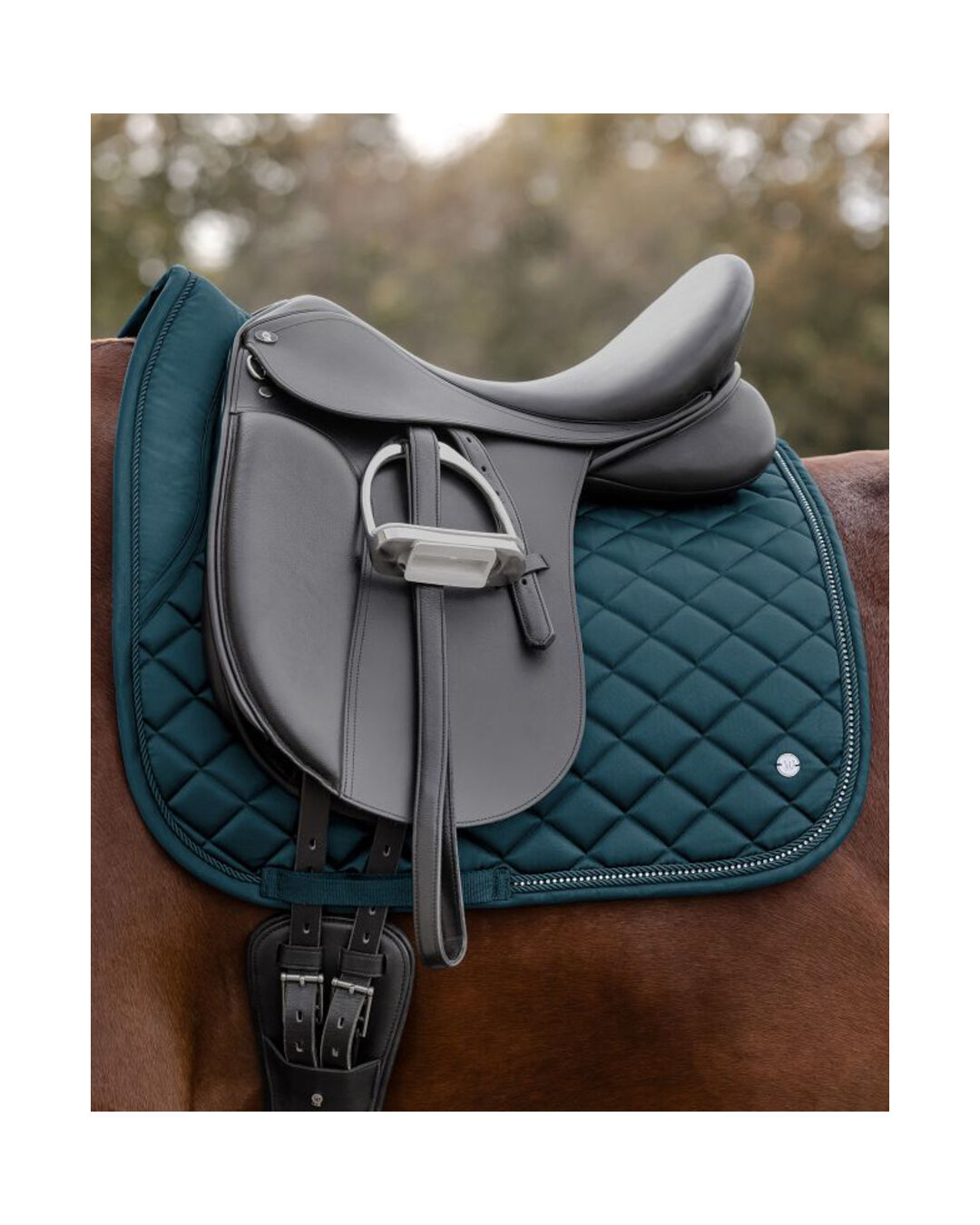 Ein schimmerndes Strassband, eingebettet zwischen zwei eleganten Zierkordeln, verleiht der Schabracke das gewisse Etwas. Das silberne Metallplättchen mit Waldhausen-Logo rundet das edle Design ab. Dabei überzeugt sie nicht nur optisch: Die hochwertige Verarbeitung sorgt für Formstabilität und einen angenehmen Sitz unter dem Sattel.