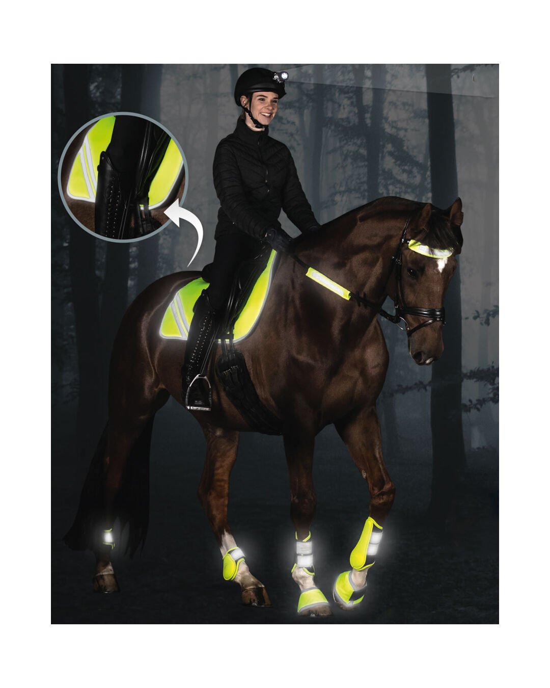 Mit ihrem leuchtend neongelben Obermaterial und den auffälligen Reflex-Details sorgt diese Schabracke für maximale Sichtbarkeit bei Dämmerung, Nebel oder in der Dunkelheit. Die Schabracke ist nicht nur ein Sicherheitsplus, sondern auch äußerst komfortabel: Die weiche Wattierung und die hautfreundliche Baumwoll-Innenseite garantieren deinem Pferd ein angenehmes Tragegefühl, selbst bei intensiven Trainingseinheiten.