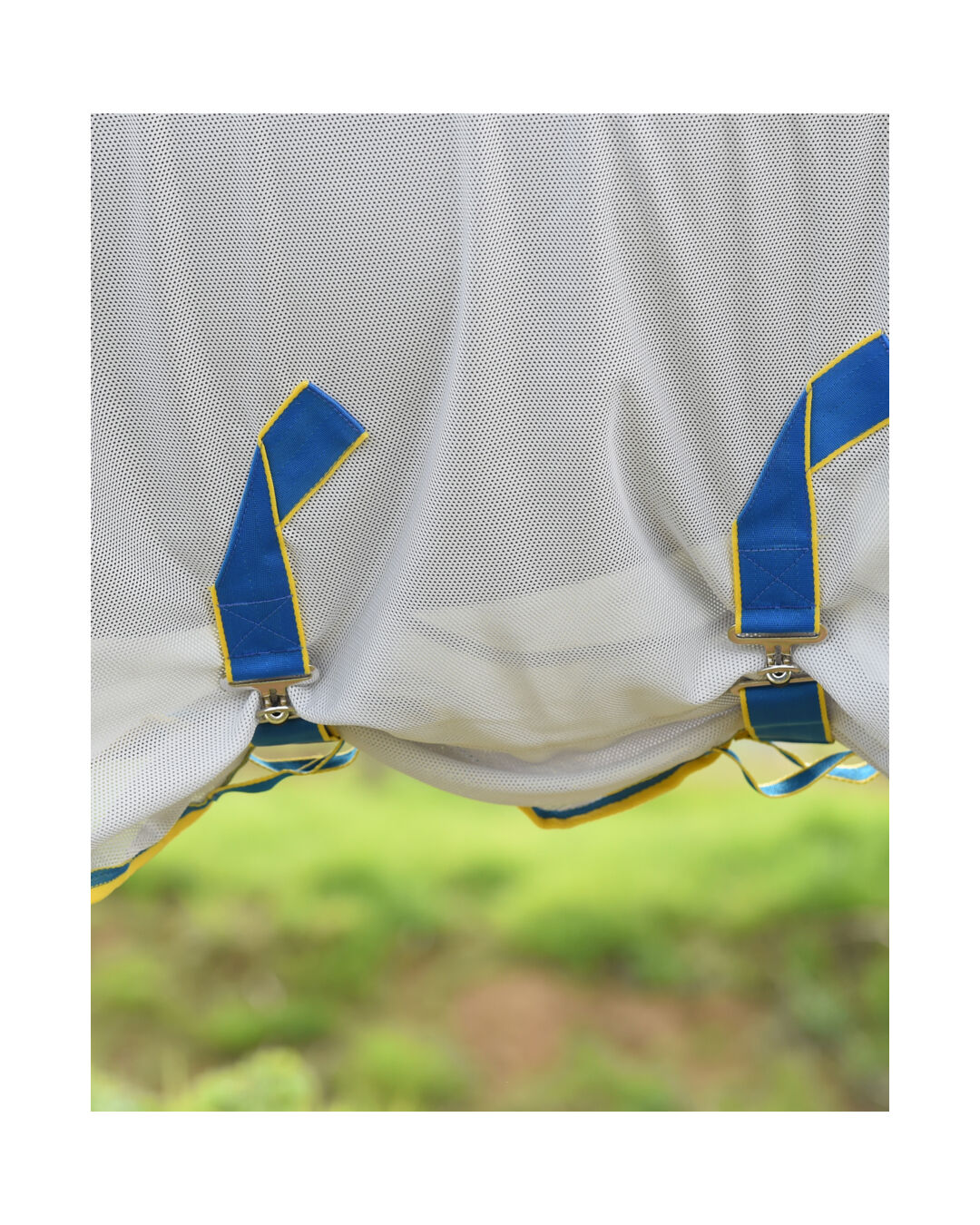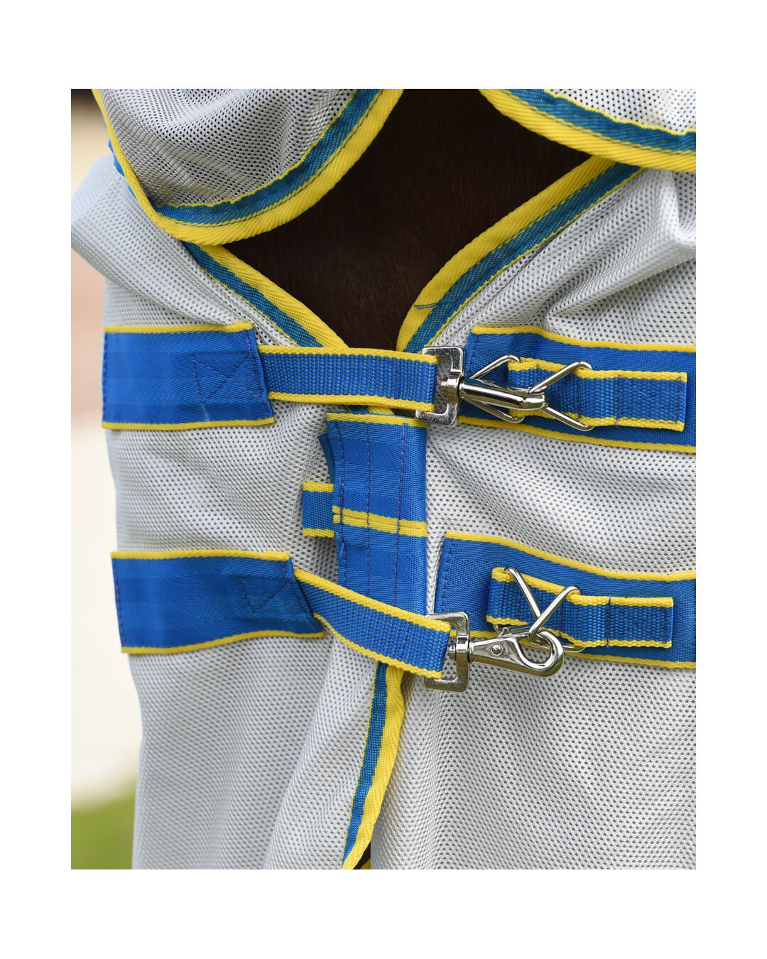 Ein elastischer Einsatz am Widerrist bietet zusätzlichen Komfort beim Grasen, und der Ultra-Bauchlatz sorgt für einen umfassenden Schutz vor Insekten. Mit dem verstellbaren Ezi-Clip-Frontverschluss lässt sich die Decke schnell und einfach anlegen, während traditionelle Gehfalten sowie die gepolsterten Bereiche an Schultern, Mähne und Schweiflatz Reibung verhindern. Elastische, verstellbare und abnehmbare Beingurte sorgen für eine sichere Passform. Die Decke bietet zudem einen UV-Schutz von über 75 %.