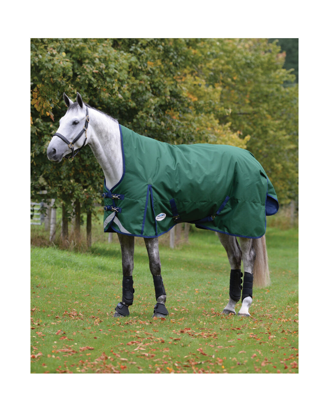 Das superstarke und strapazierfähige 1200 Denier Obermaterial mit Dreifach-Webbindung und Guard-Tec-Beschichtung ist nicht nur wasserdicht, sondern auch atmungsaktiv. An der neuen WeatherBeeta Temperaturanzeige-Marke erkennst du, dass diese Decke ein 100 g Polyfill hat. Der robuste und strapazierfähige 210 Denier Futterstoff sorgt für weniger Reibung und Scheuern des Fells, während es glanzgebende und antibakterielle Eigenschaften hat. Das komfortable Memory-Schaum-Polster am Widerrist passt sich der Form deines Pferdes individuell an und hebt die Decke etwas vom Widerrist ab, um ebenfalls ein Scheuern zu reduzieren.