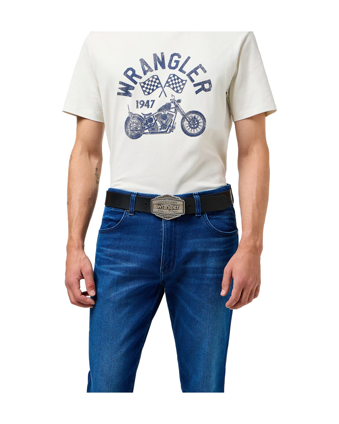 • Große silberfarbene Metallschnalle mit Wrangler-Branding