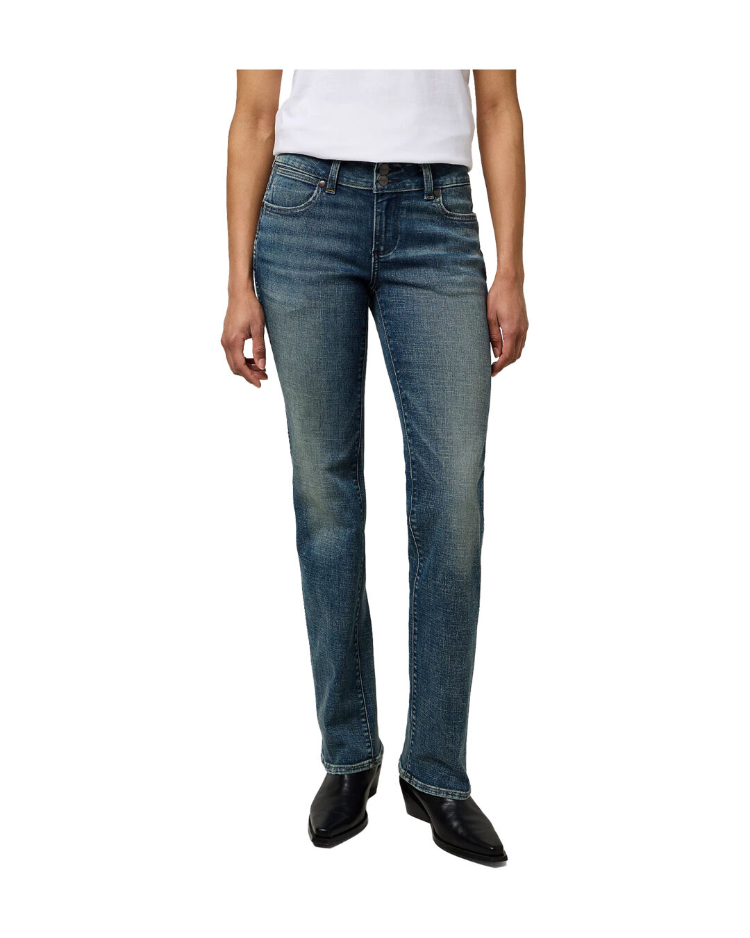 Mit ihrer niedrigen Bundhöhe sitzt sie bequem auf den Hüften und betont die Figur. Der schmale Oberschenkel streckt optisch die Beine, während die Bootcut-Beinöffnung für eine ausbalancierte, feminine Silhouette sorgt. So lässt sich die Jeans vielseitig kombinieren – ob zu Stiefeln, Heels oder Sneakern.