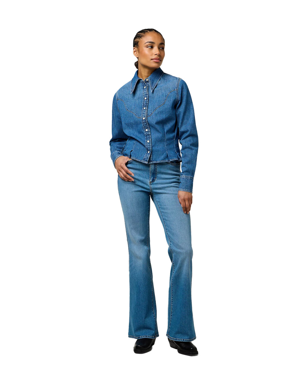 Typische Western-Details wie die Westernpasse, Druckknopfverschlüsse vorne und an den Bündchen runden den Look authentisch ab. Damit vereint es das Beste aus klassischem Denim-Spirit und modernem, femininen Design.