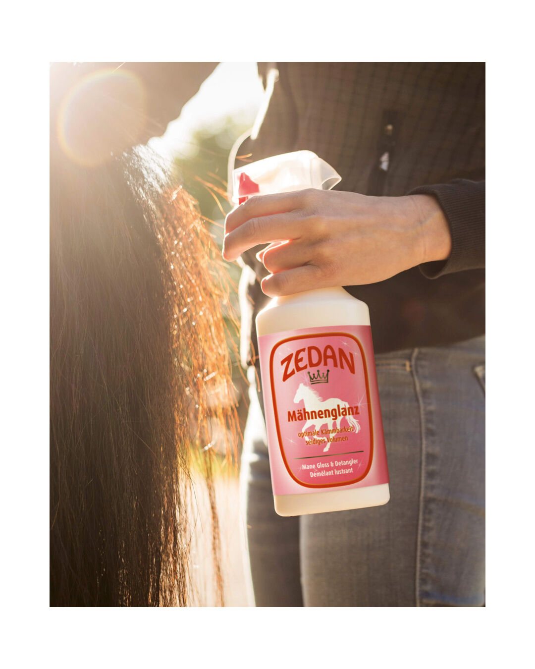 Das Mähnenspray Mähnenglanz von ZEDAN verleiht Mähne, Fell und Schweif deines Pferdes einen außergewöhnlichen, lang anhaltenden seidigen Glanz und mehr Volumen.